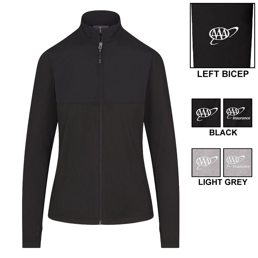 Crafted from lightweight, stretchy, and soft fabrics, this eco-conscious jacket is both easy to style and wear. Ideal for pre-or post-exercise or pairing with jeans for casual outings. Composed of 88% recycled polyester and 12% spandex, each women's jacket utilizes 32 recycled bottles. Features include a soft knit fabric with woven chest and back panels, and convenient side zipper pockets.
