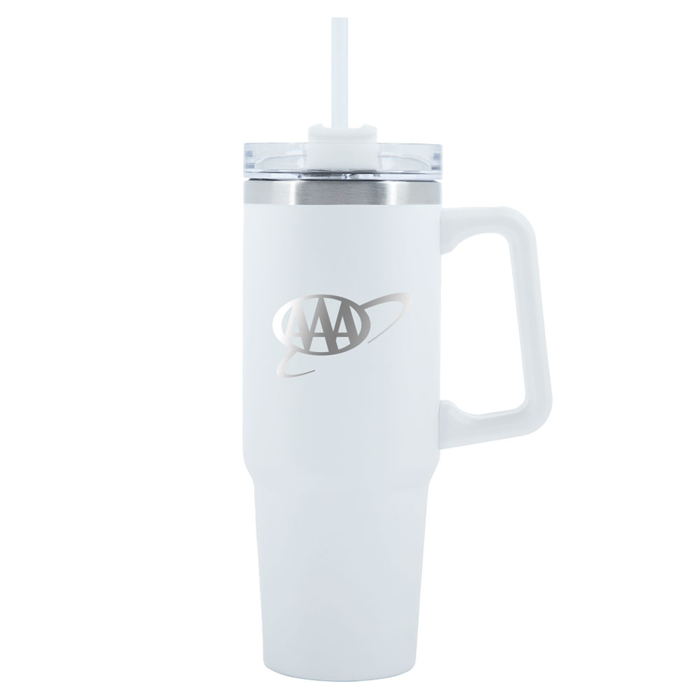 This tumbler embodies a commitment to excellence with its double-wall construction and recycled 18/8 steel inner wall, ensuring beverages stay cold for 12 hours and hot for 8 hours. The versatile threaded lid with a rotating closure allows you to choose between sipping from the sipper hole for hot drinks or using the straw for cold ones, while the wide opening simplifies cleaning and adding ice. Featuring a high-quality, durable powder coating, it resists scratches, and the ergonomic handle offers a comfortable, secure grip. It's BPA Free and FDA Compliant.